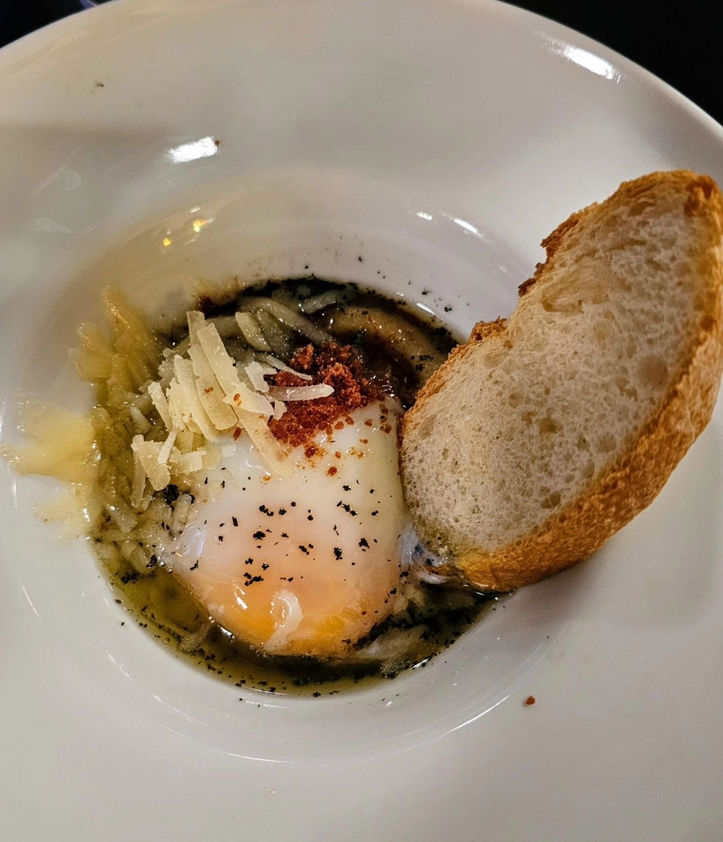 Egg with truffle oil, Parmesan cheese and ham. Very rich, very delicious.